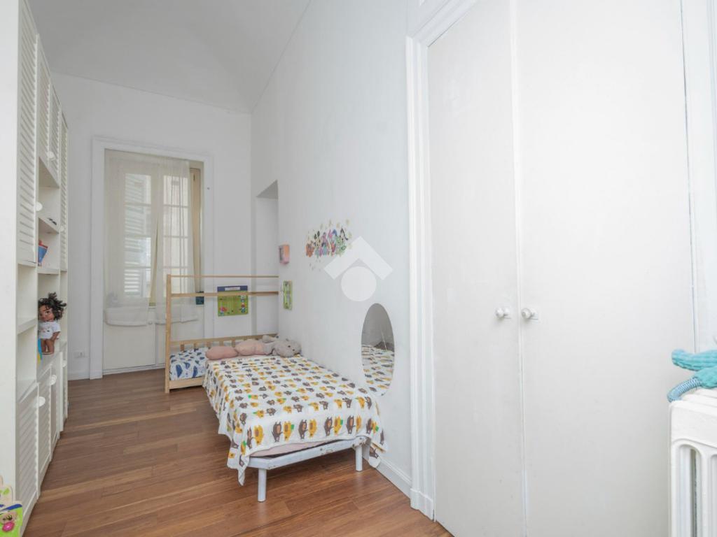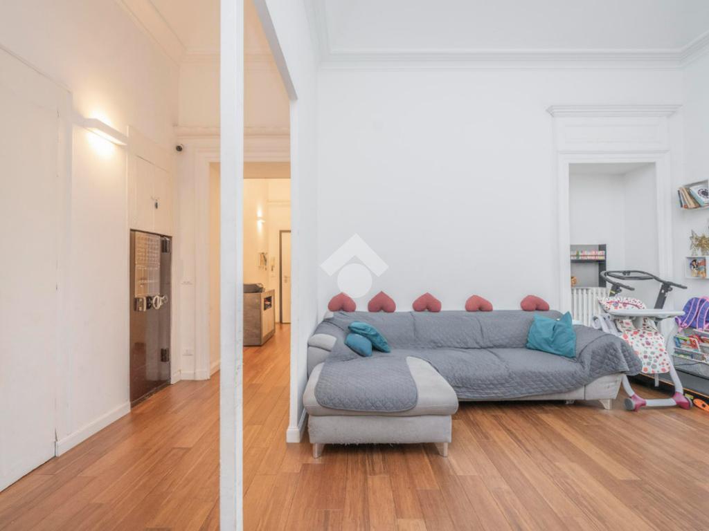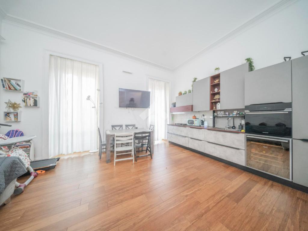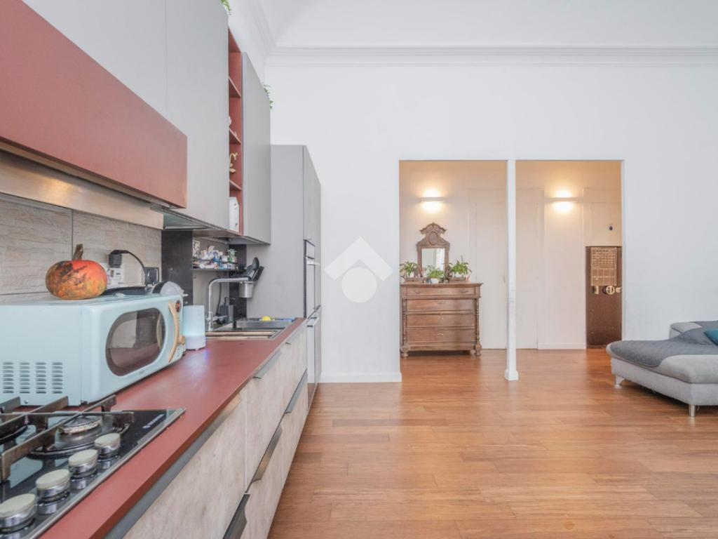 L'ingresso, da pianerottolo, si apre su un lungo disimpegno che conduce agli ambienti principali dell'abitazione. Da qui si accede direttamente all' ampio soggiorno con cucina a vista: un ambiente incantevole con soffitti imponenti e balcone su interno cortile.