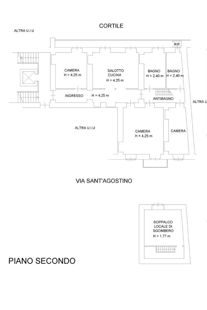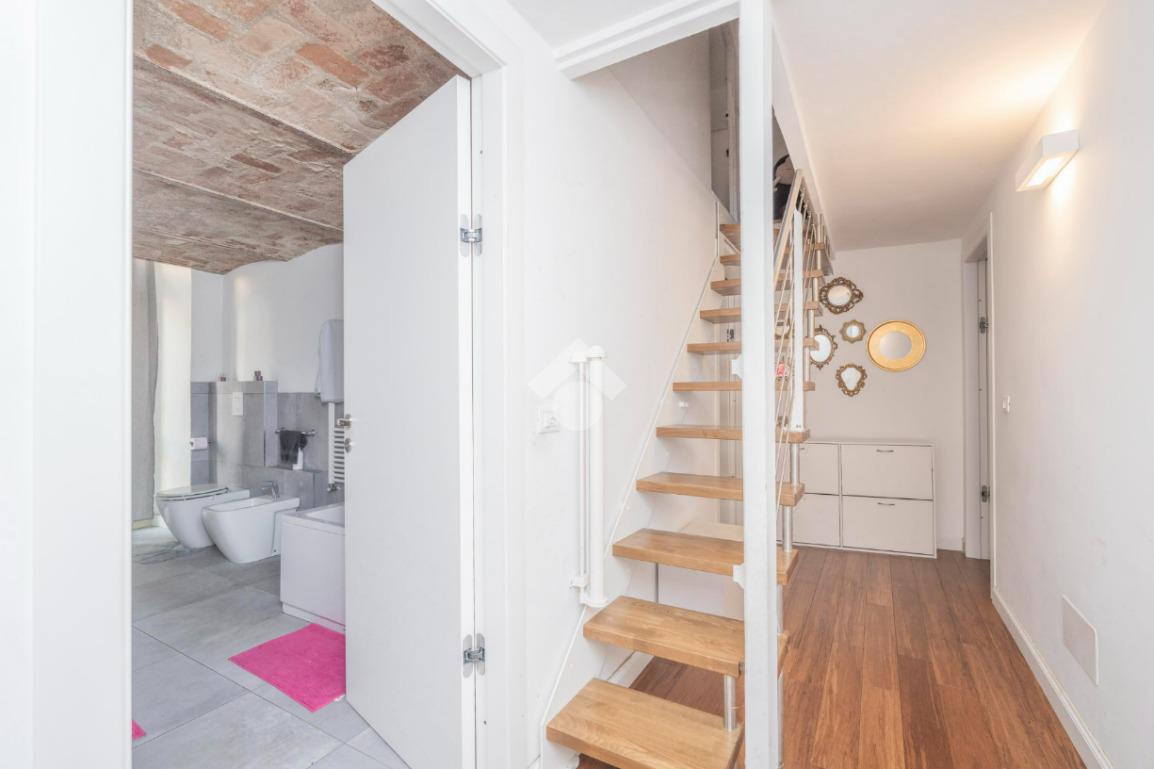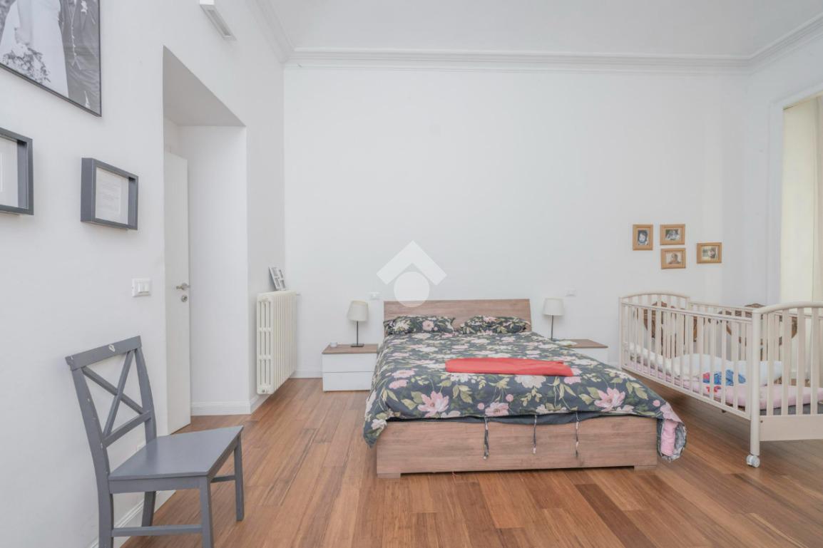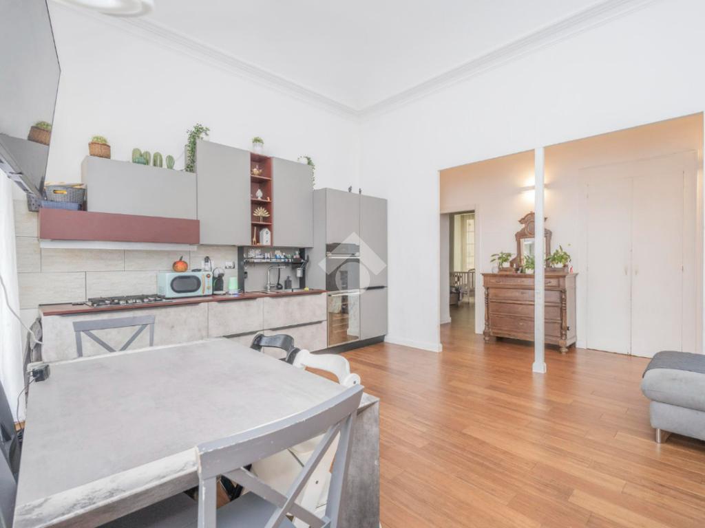 L'ingresso, da pianerottolo, si apre su un lungo disimpegno che conduce agli ambienti principali dell'abitazione. Da qui si accede direttamente all' ampio soggiorno con cucina a vista: un ambiente incantevole con soffitti imponenti e balcone su interno cortile.